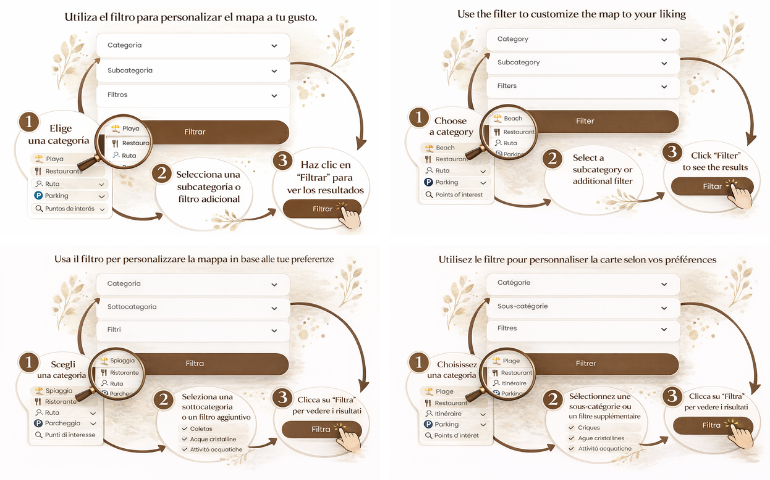 Once you have visualized the area, the most useful next step is to follow the filter logic. Start with a main category —such as dining, leisure, routes, or parking— and then refine it with the subcategory or filter that best matches your plan. This combination turns the map from something inspirational into something truly practical, because it stops showing you “all of Ibiza” and starts showing you exactly what you need at that moment.
