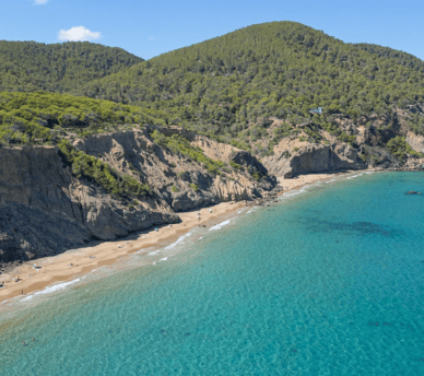 We leave San Antonio heading northeast along the rural road to Sant Carles, passing pine trees and peaceful landscapes. On the way we discover almost secret coves, starting with Aigües Blanques, a golden-sand beach beneath cliffs, known for its relaxed atmosphere and slightly wild vibe.